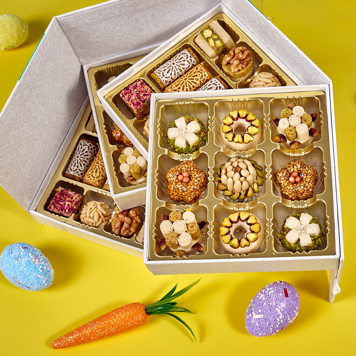 This Easter gift box is full of decadent Mediterranean treats, making it the perfect way to celebrate the season of renewal and joy. Handcrafted with an artisan's passion, this one-of-a-kind box is filled with delightful bites that blend nutty flavors with just the right touch of sweetness—perfect for sharing after an Easter egg hunt or gifting to loved ones. A true springtime indulgence that’s sure to bring smiles!