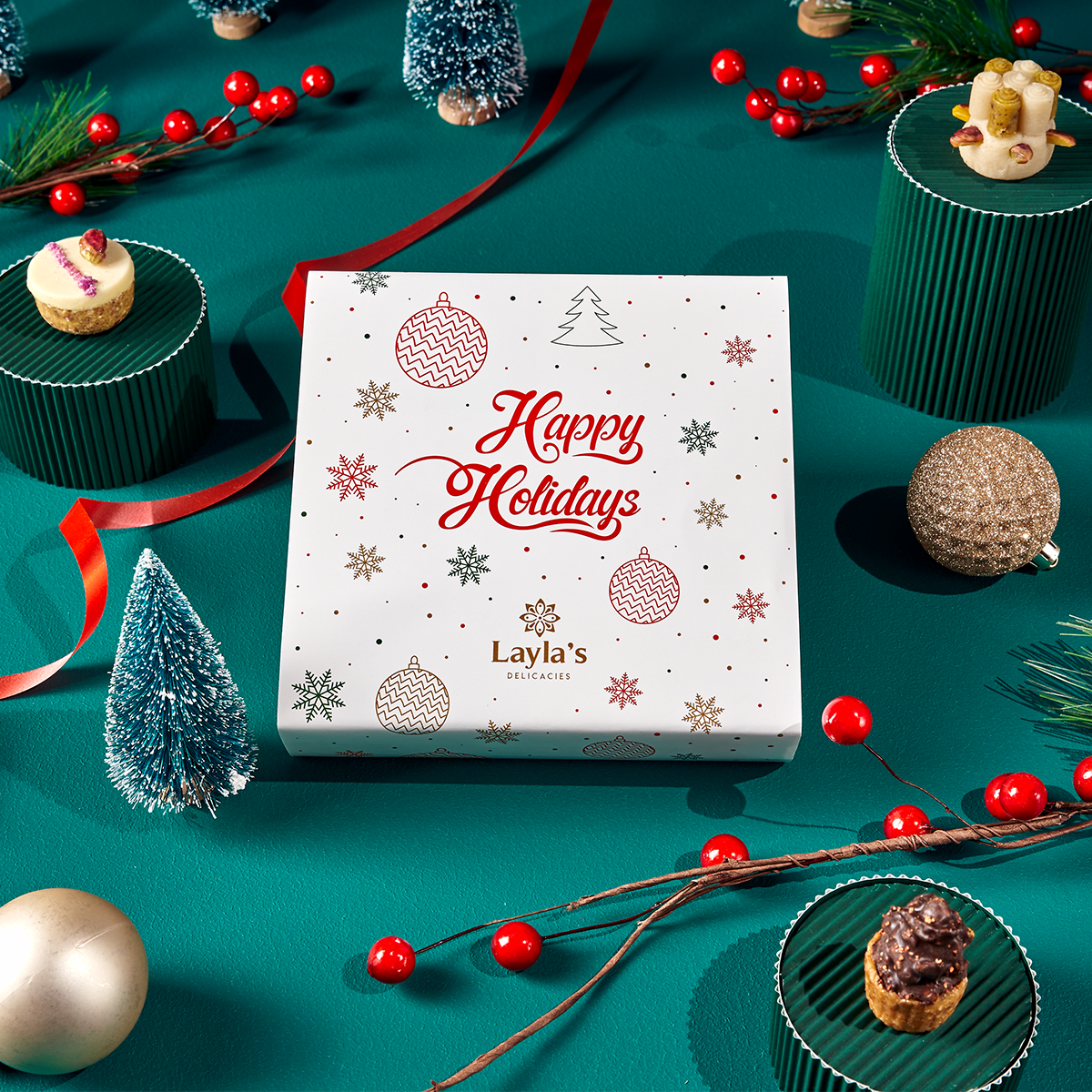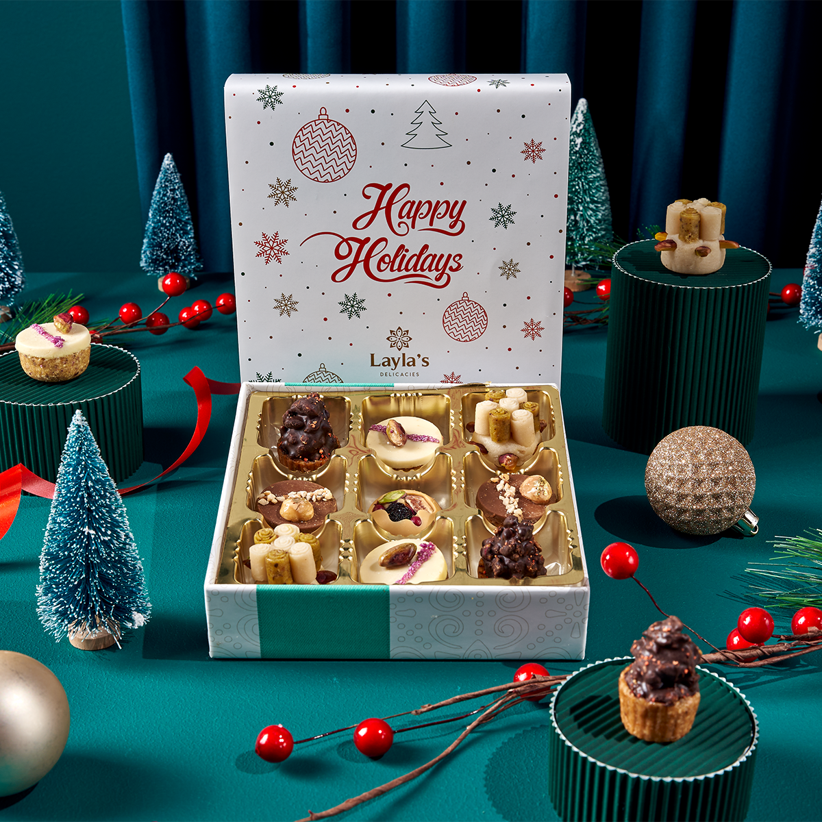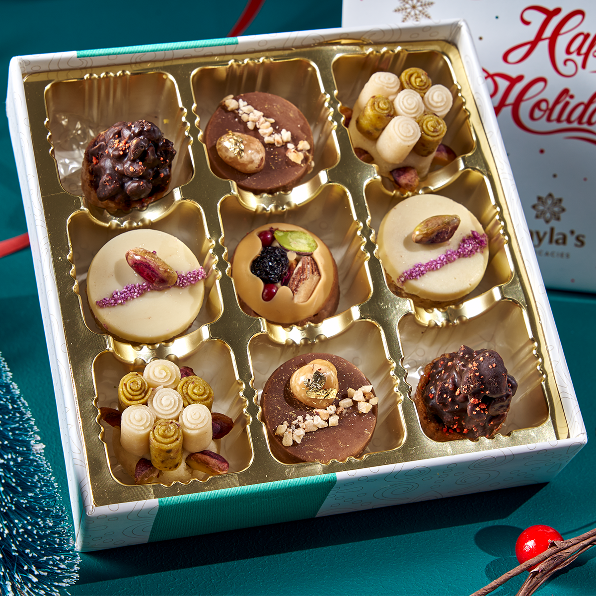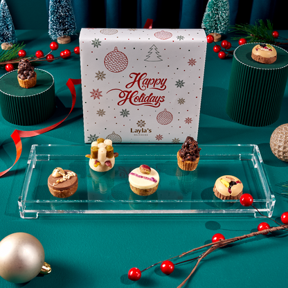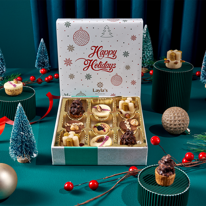 This Happy Holidays box is full of decadent Mediterranean treats and will be the perfect way to show your family and friends you care. Prepared with an artisan's passion in mind, this one-of-a-kind box contains an assortment of delicious pieces of art, with just the right combination of nutty flavors - not overly sweet but just enough for indulgence on this special occasion. This unique gift will be their new favorite way to celebrate!