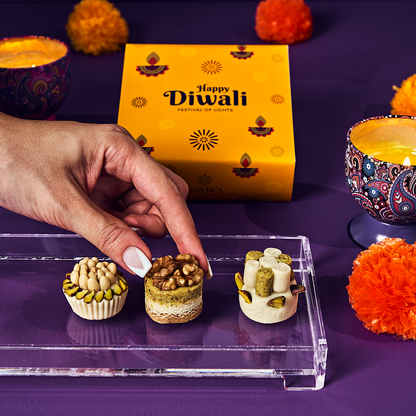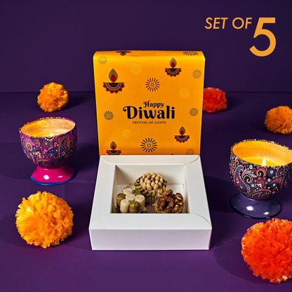 Celebrate Diwali with our exclusive set of five beautifully crafted gift boxes, each filled with an assortment of exquisite, nutty delights. These charming boxes are designed to impress, making them the perfect gift for loved ones or a delightful treat for your guests. Add a touch of elegance and flavor to your Diwali celebrations with this luxurious set, ensuring a memorable and joyful festival.