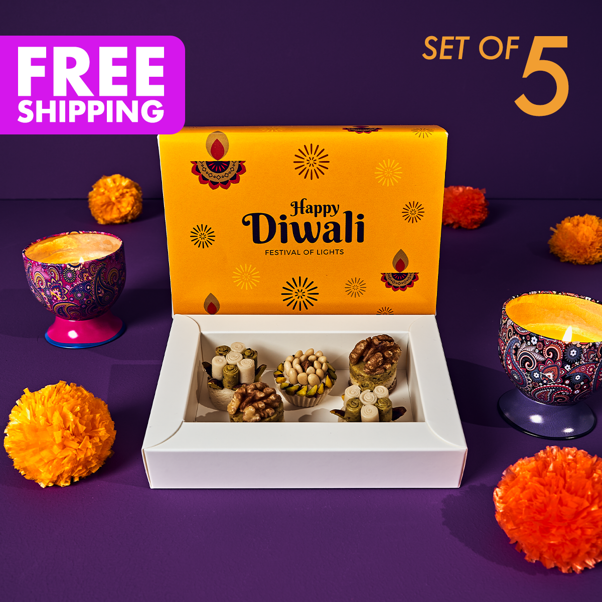 Celebrate Diwali with our exclusive set of five beautifully crafted gift boxes, each filled with an assortment of exquisite, nutty delights. These charming boxes are designed to impress, making them the perfect gift for loved ones or a delightful treat for your guests. Add a touch of elegance and flavor to your Diwali celebrations with this luxurious set, ensuring a memorable and joyful festival.